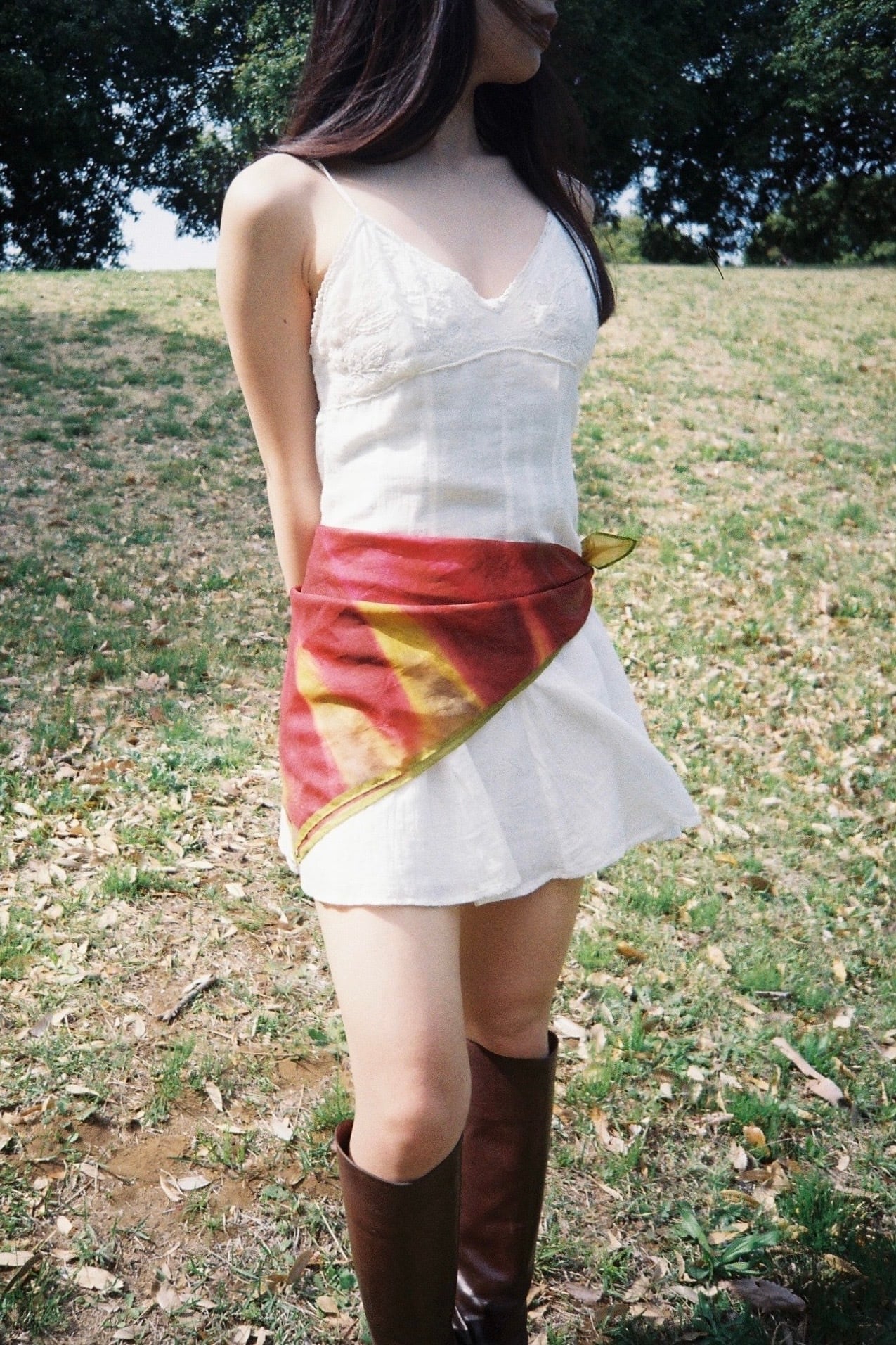 差し込まれたグリーンやイエローは、芽吹きのような軽やかさと自由な遊び心をプラスし、羽ばたくように揺れる大きなウェーブ柄は、身につけるたびにシルエットに動きをもたらします。