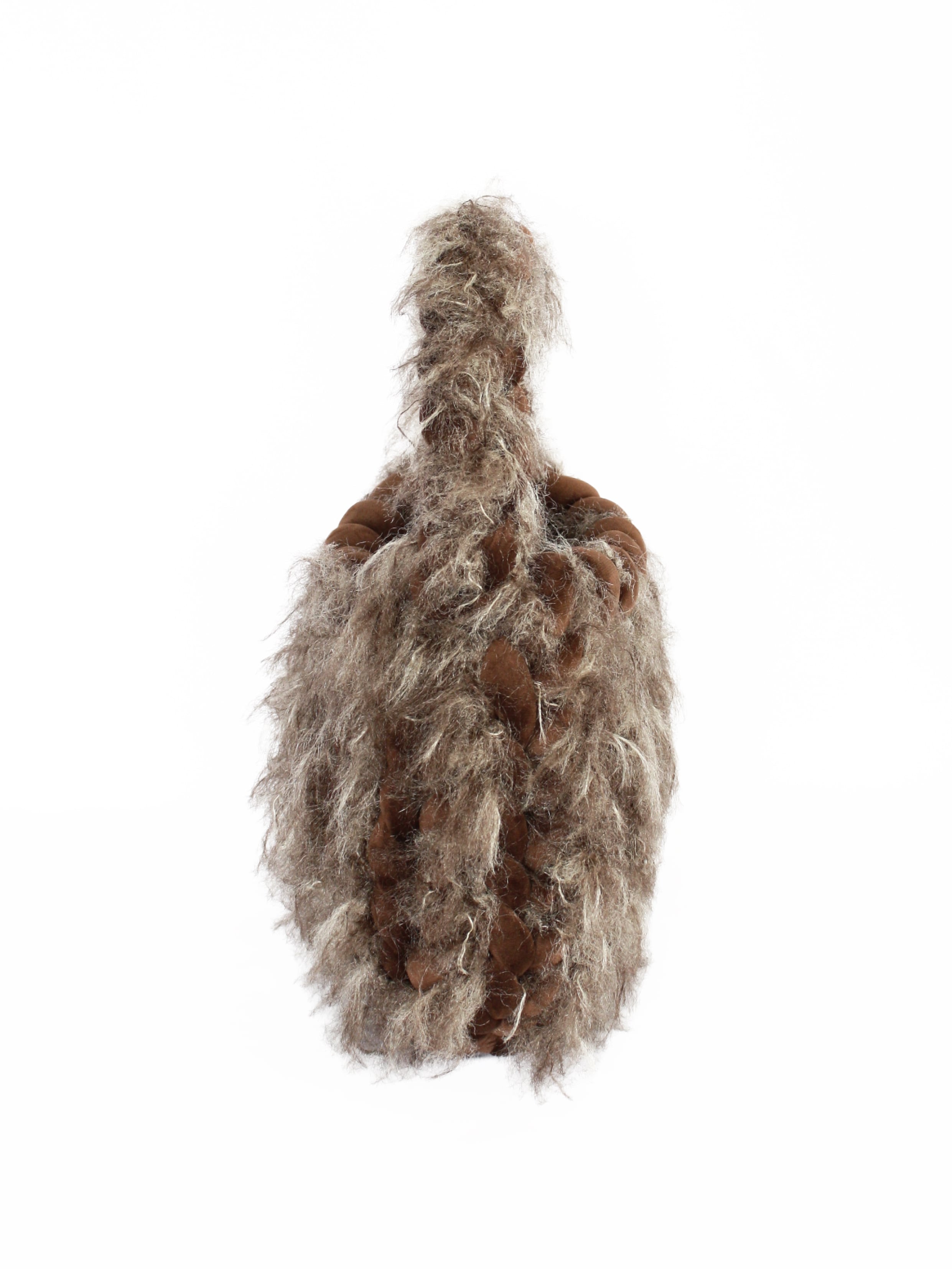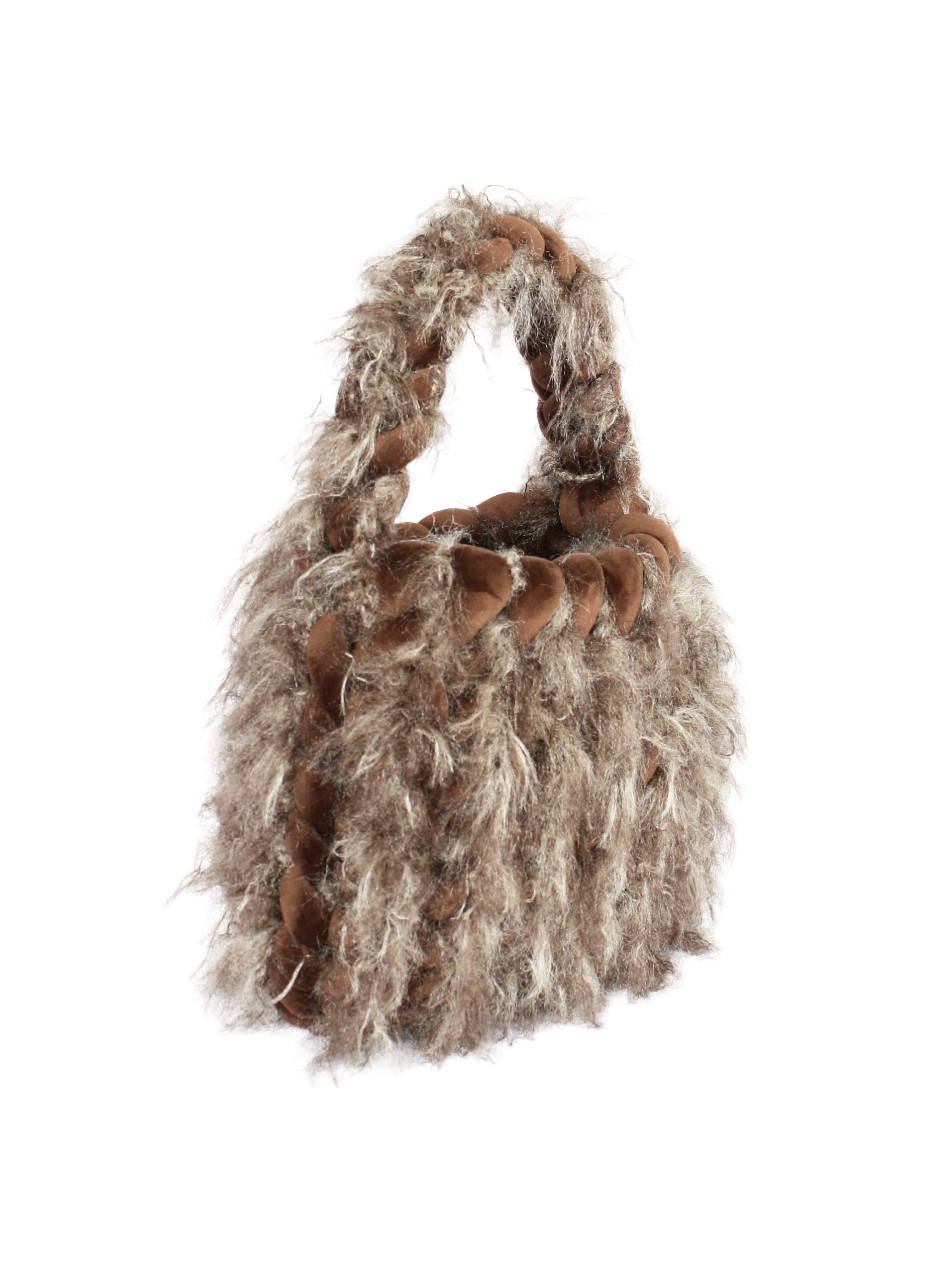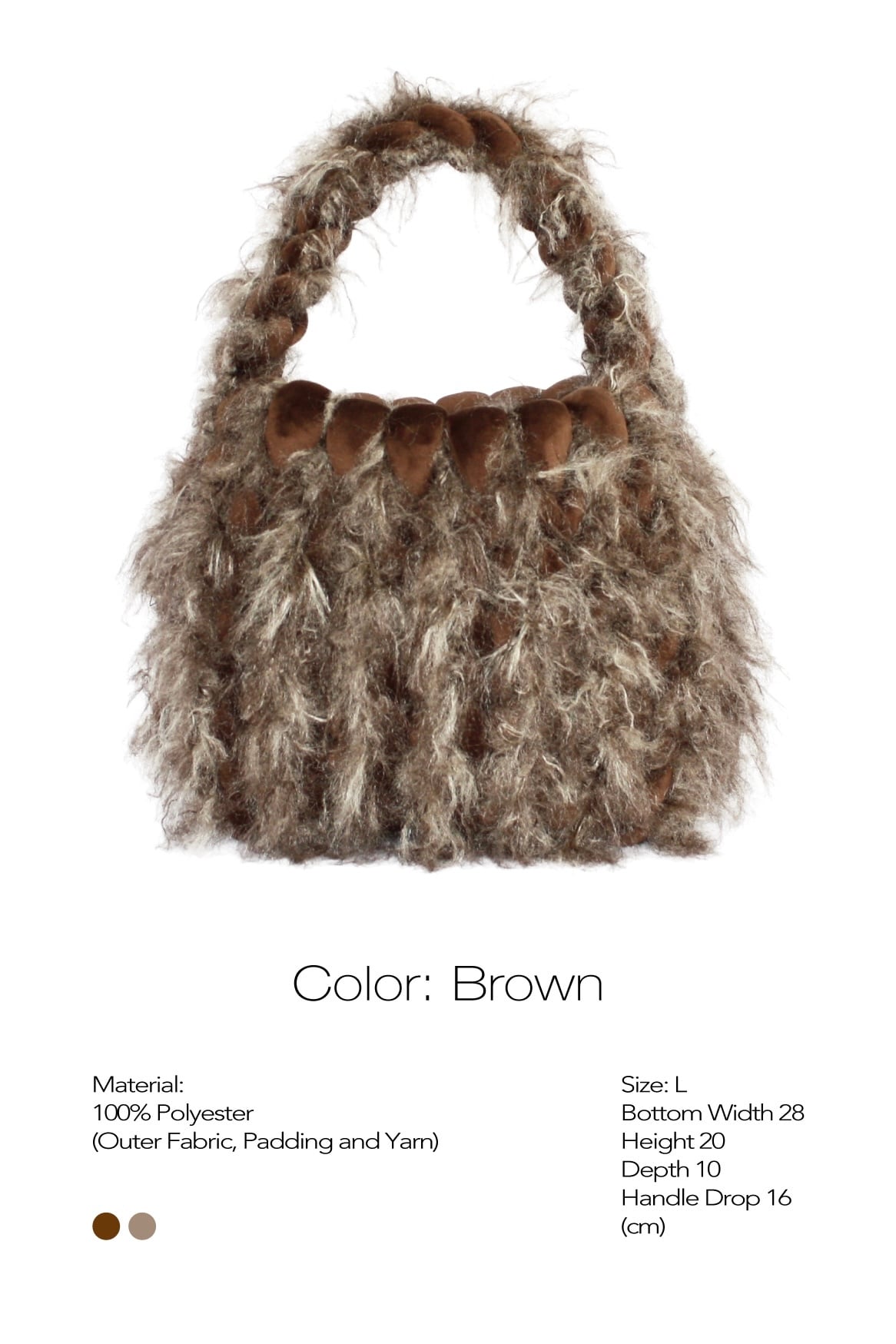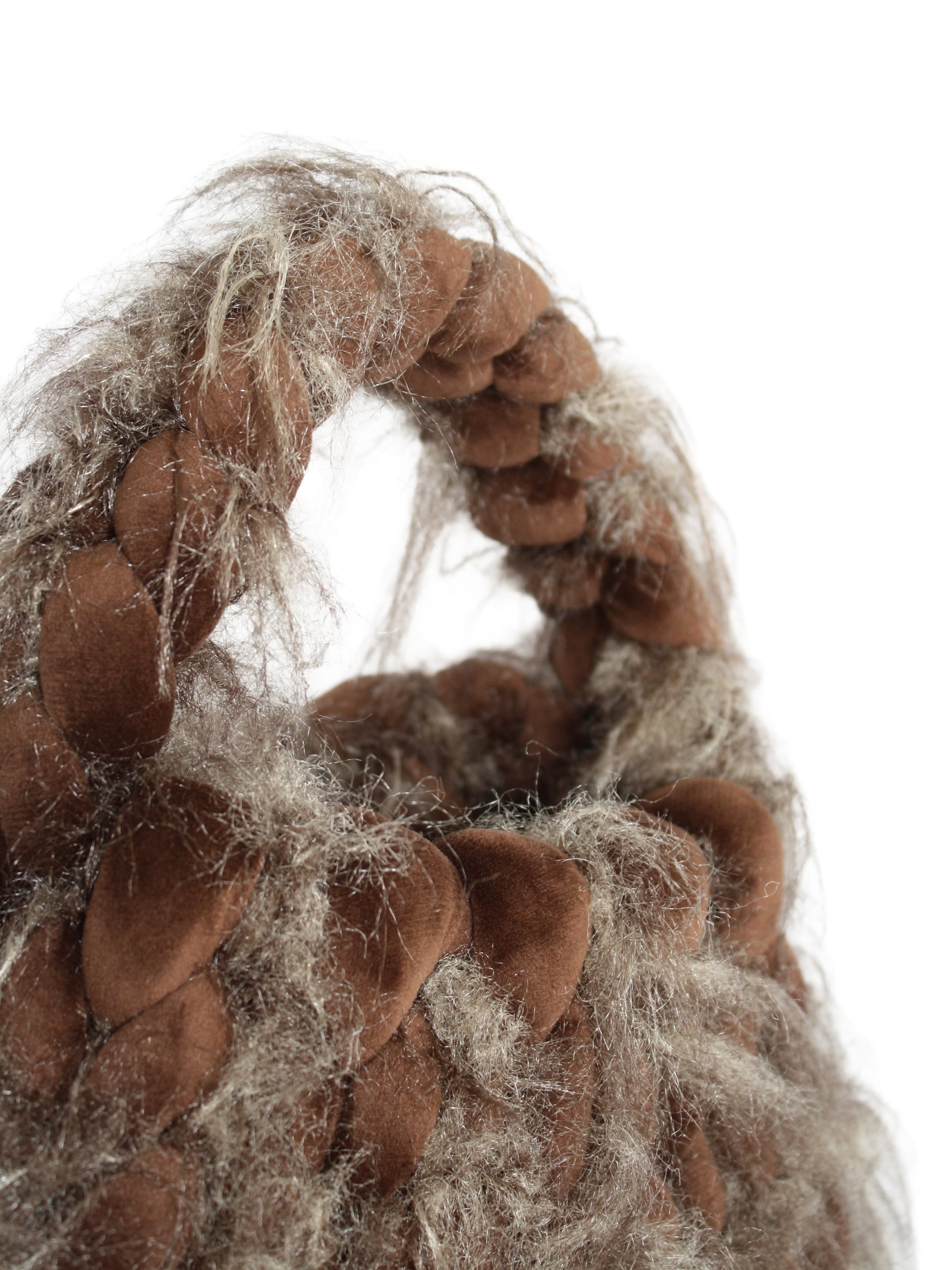 重厚感のあるダークブラウンを基調にしたバッグは、日本製のファーヤーンとベロアのチャンキーニットで仕上げられています。レーヨン混の毛糸を使用しているため、手に触れた瞬間に感じる、滑らかさと温かみが魅力です。