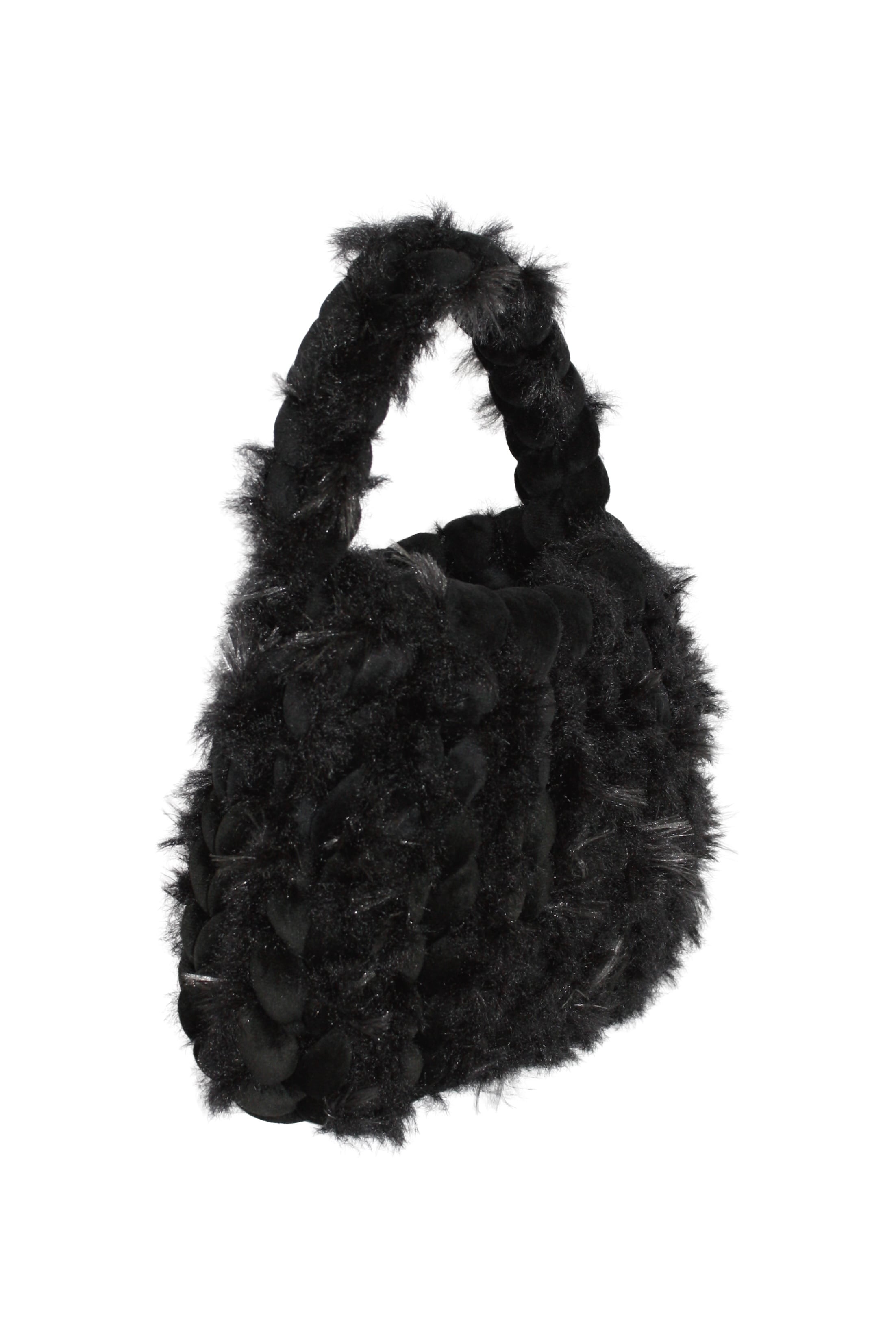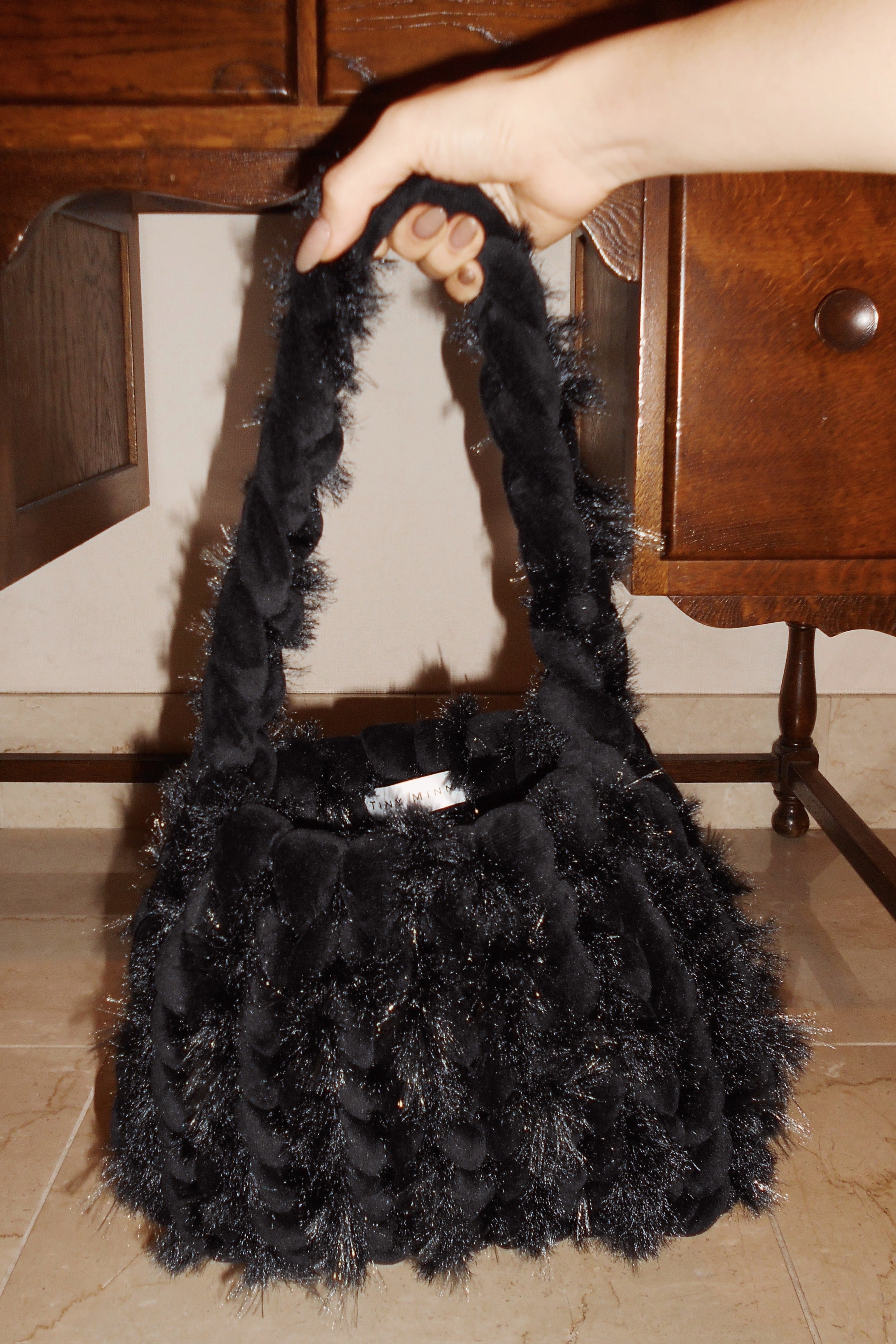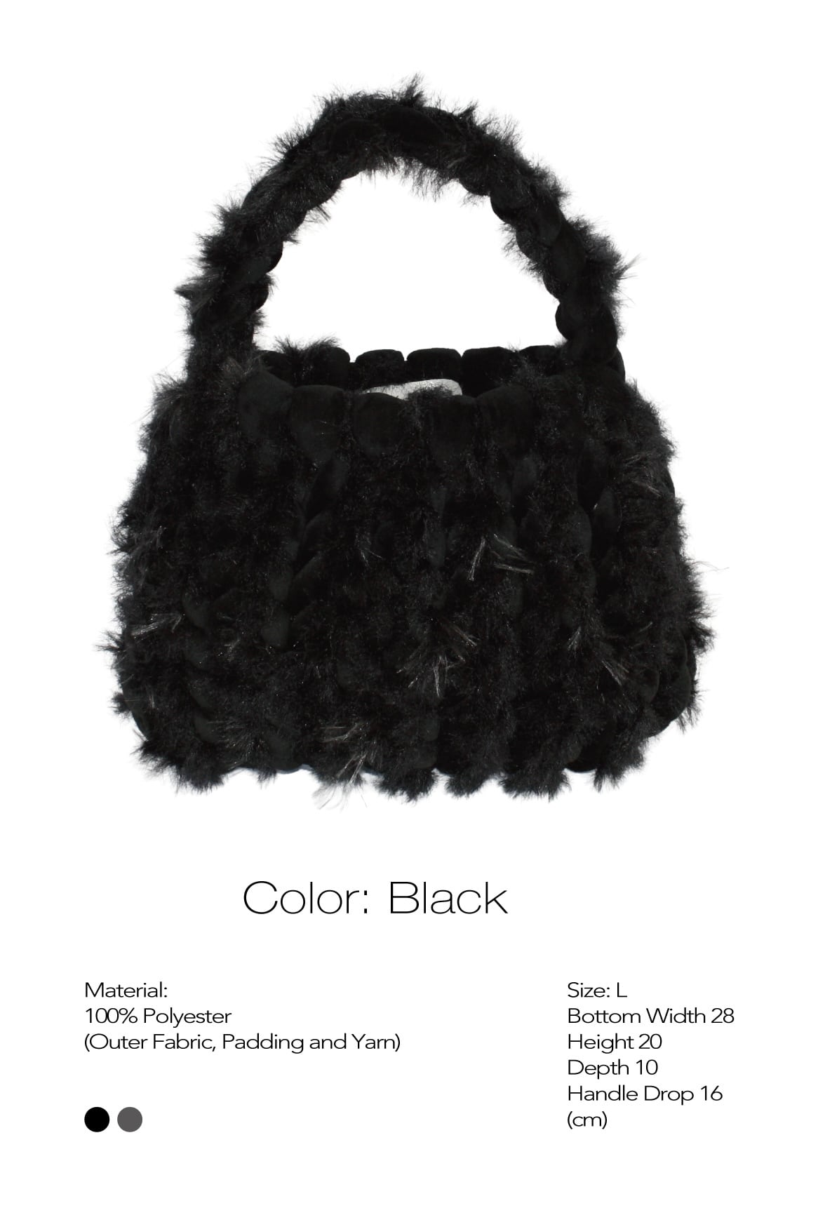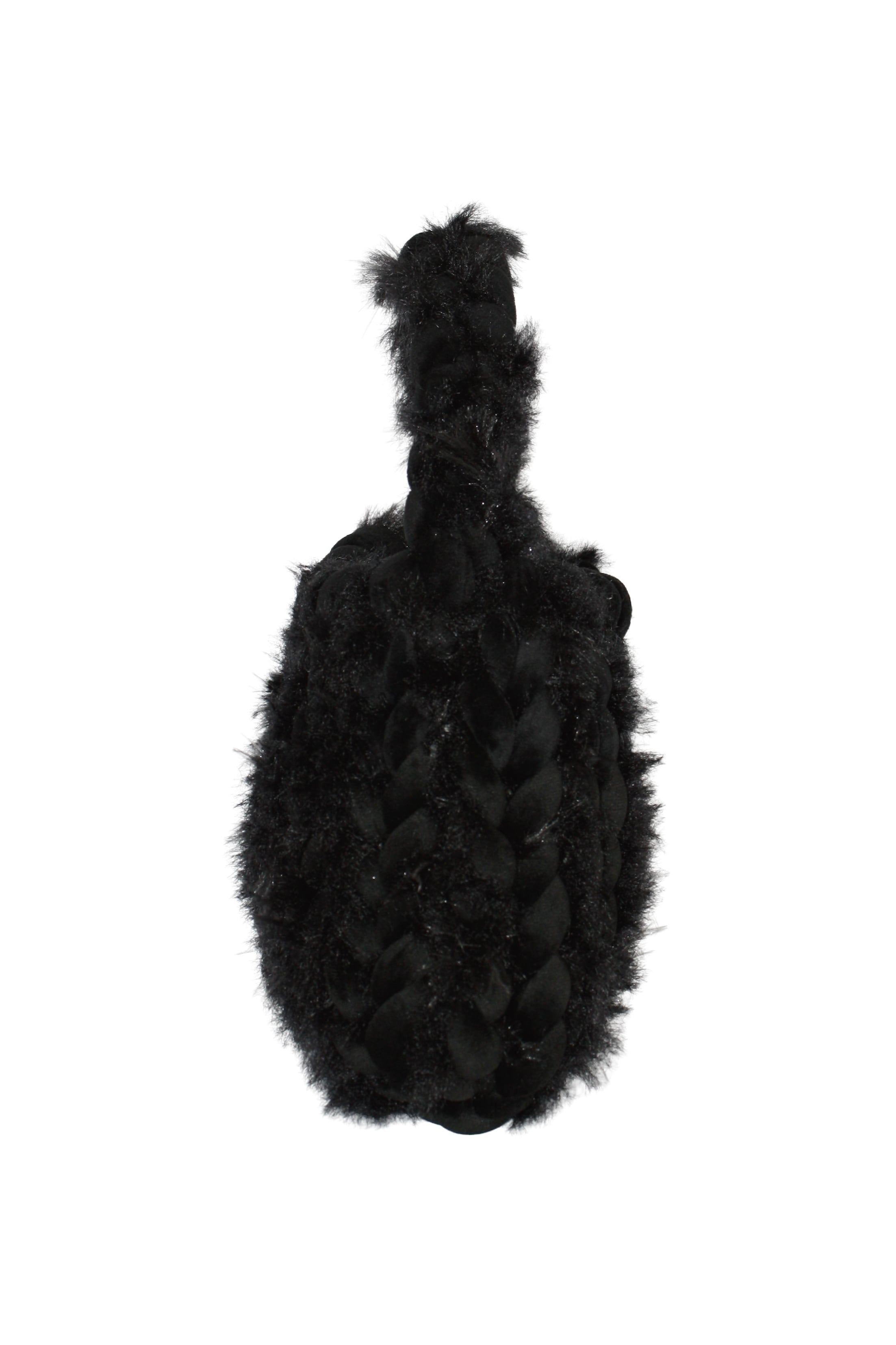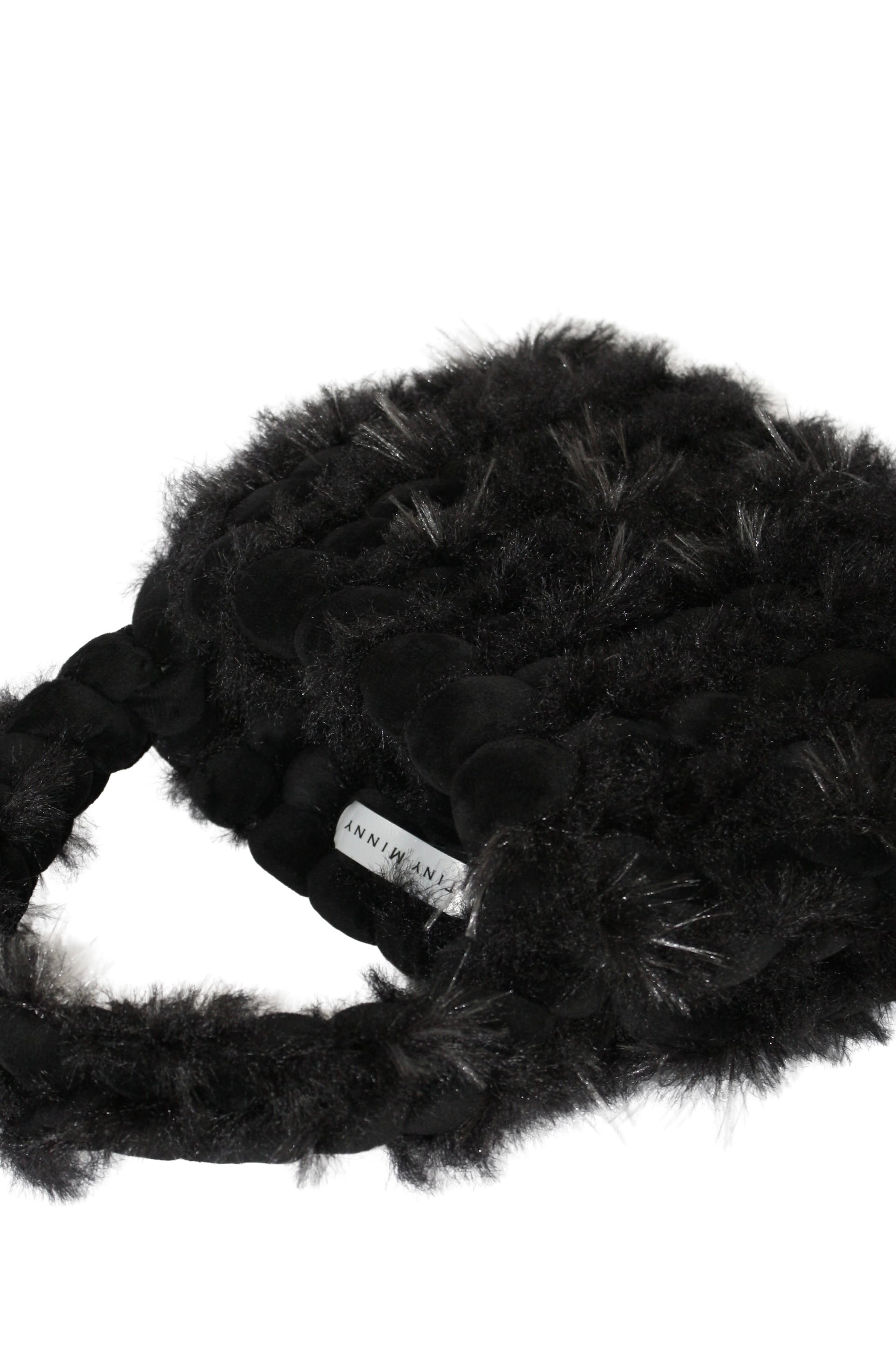 ベロアのなめらかな手触りとレーヨン混の毛糸の光沢感が、ブラックの中に軽やかな輝きを与え、奥行きのある独特の質感を演出。毛糸にはブラックにグレーが織り交ぜられており陰影が生まれることで、より立体的な印象に。ツンとした質感ながらも柔らかさを兼ね備えた独特な手触りが特徴です。