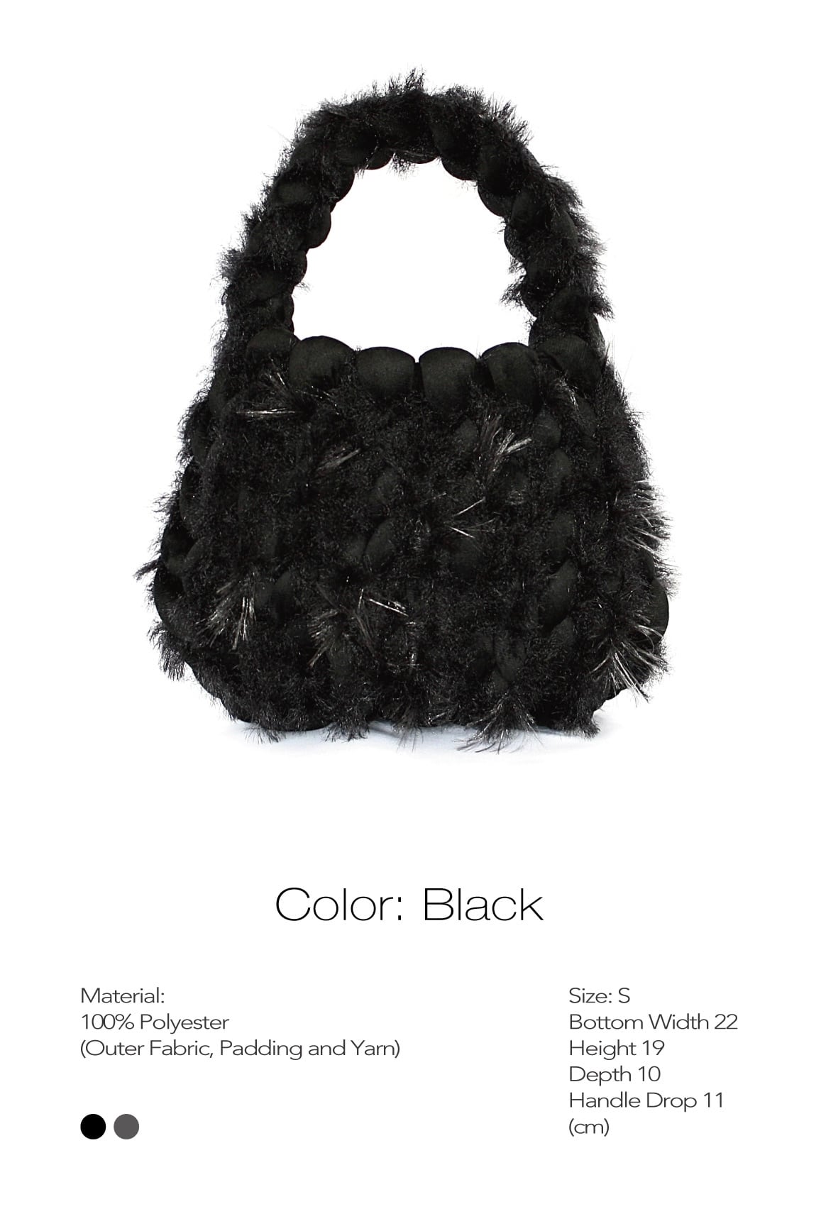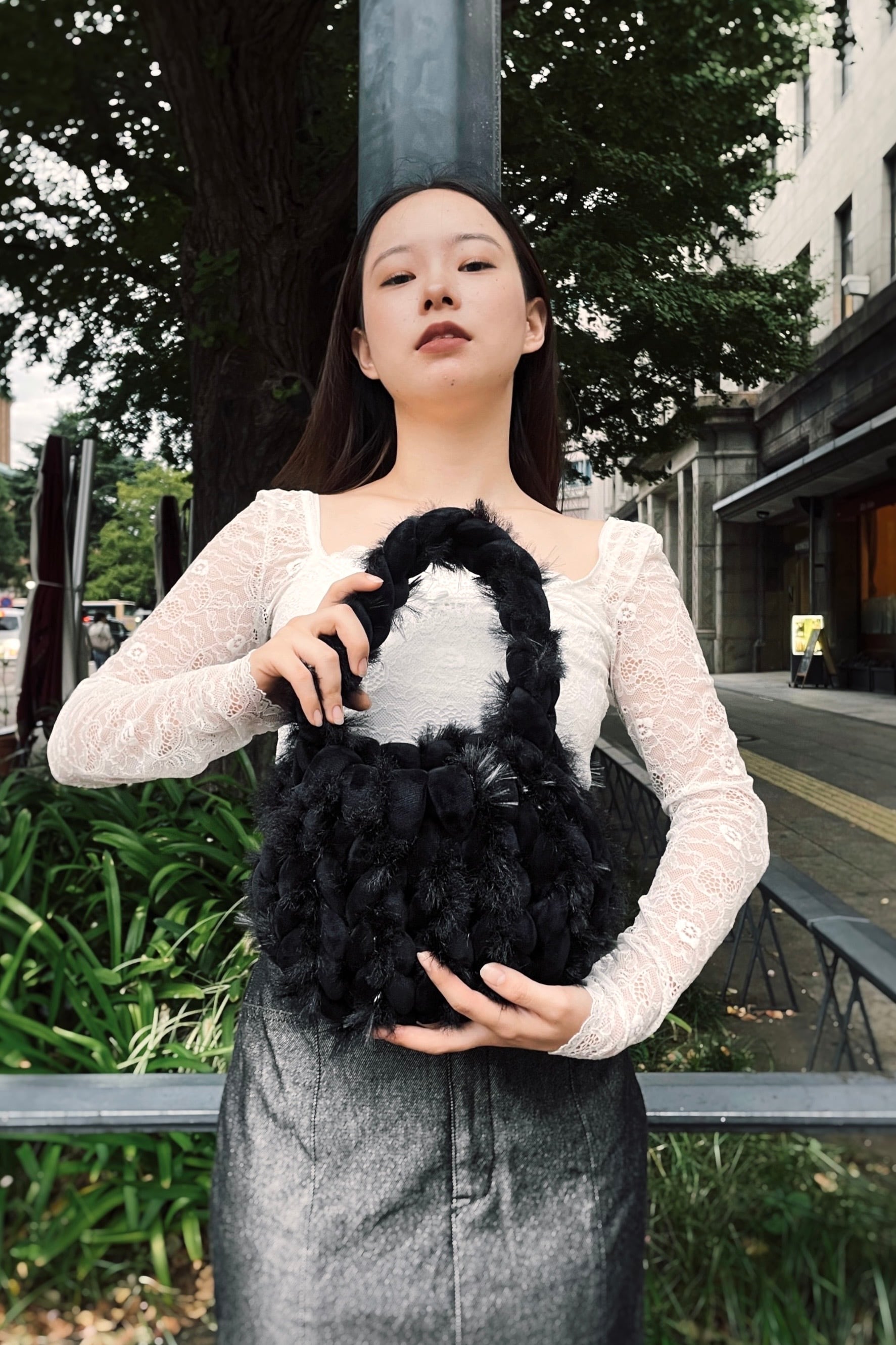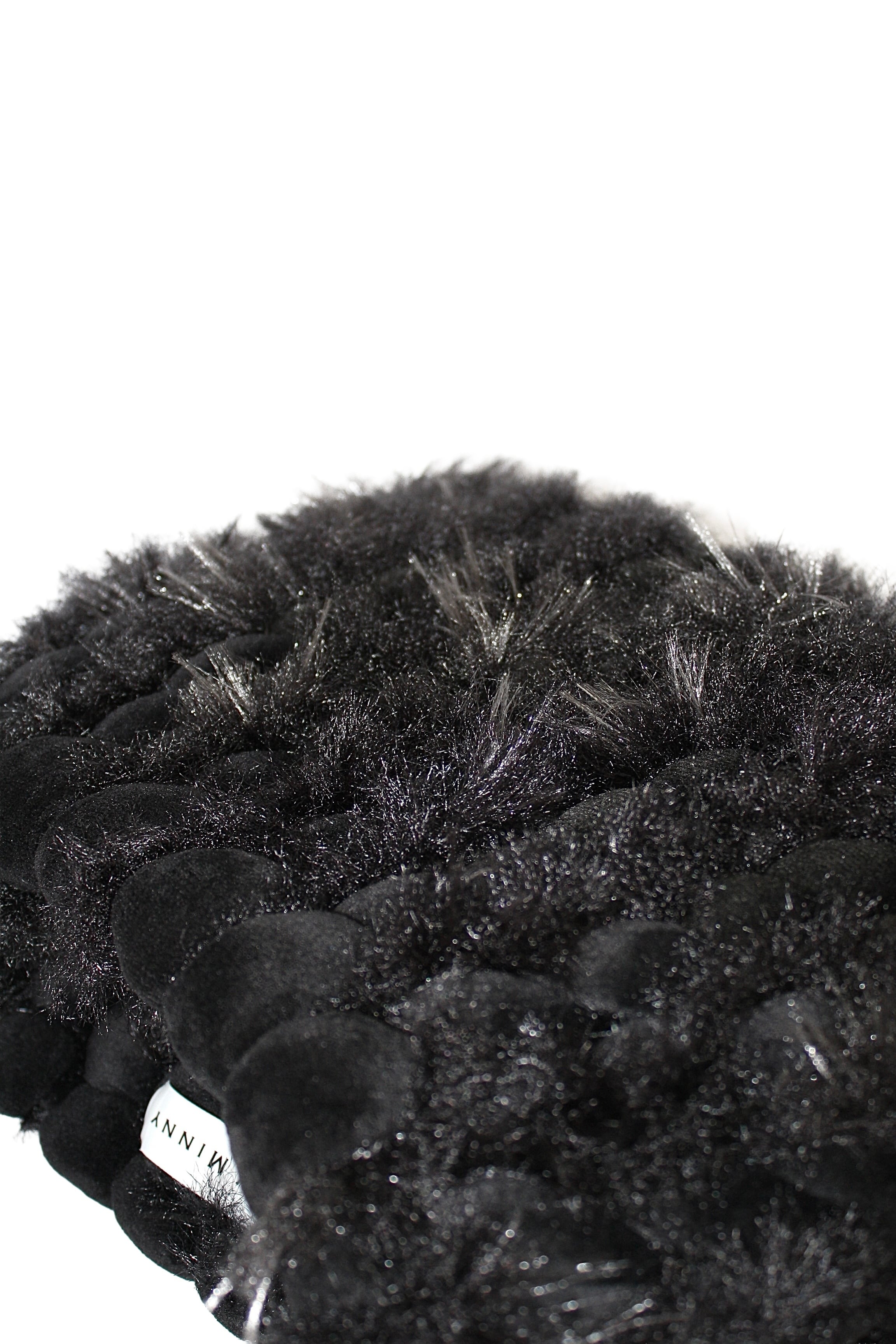 ベロアのなめらかな手触りとレーヨン混の毛糸の光沢感が、ブラックの中に軽やかな輝きを与え、奥行きのある独特の質感を演出。毛糸にはブラックにグレーが織り交ぜられており陰影が生まれることで、より立体的な印象に。ツンとした質感ながらも柔らかさを兼ね備えた独特な手触りが特徴です。