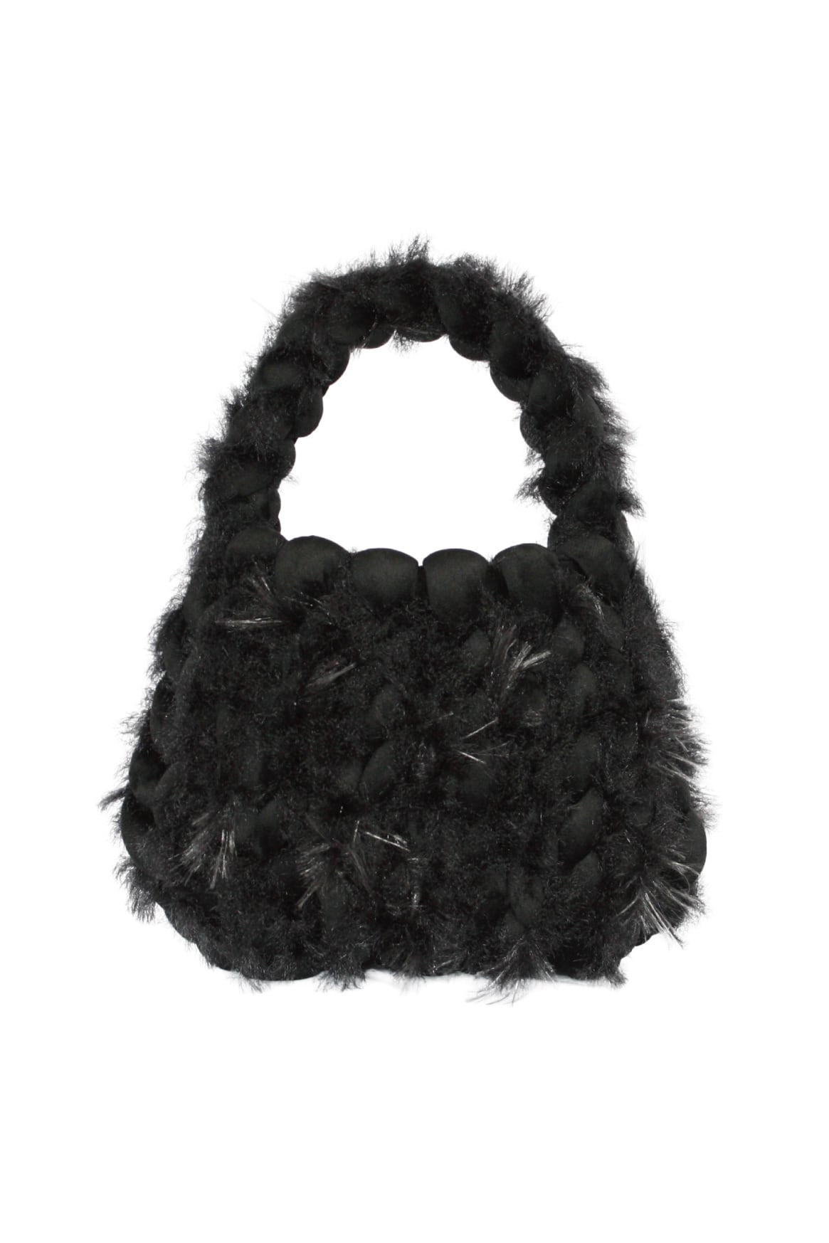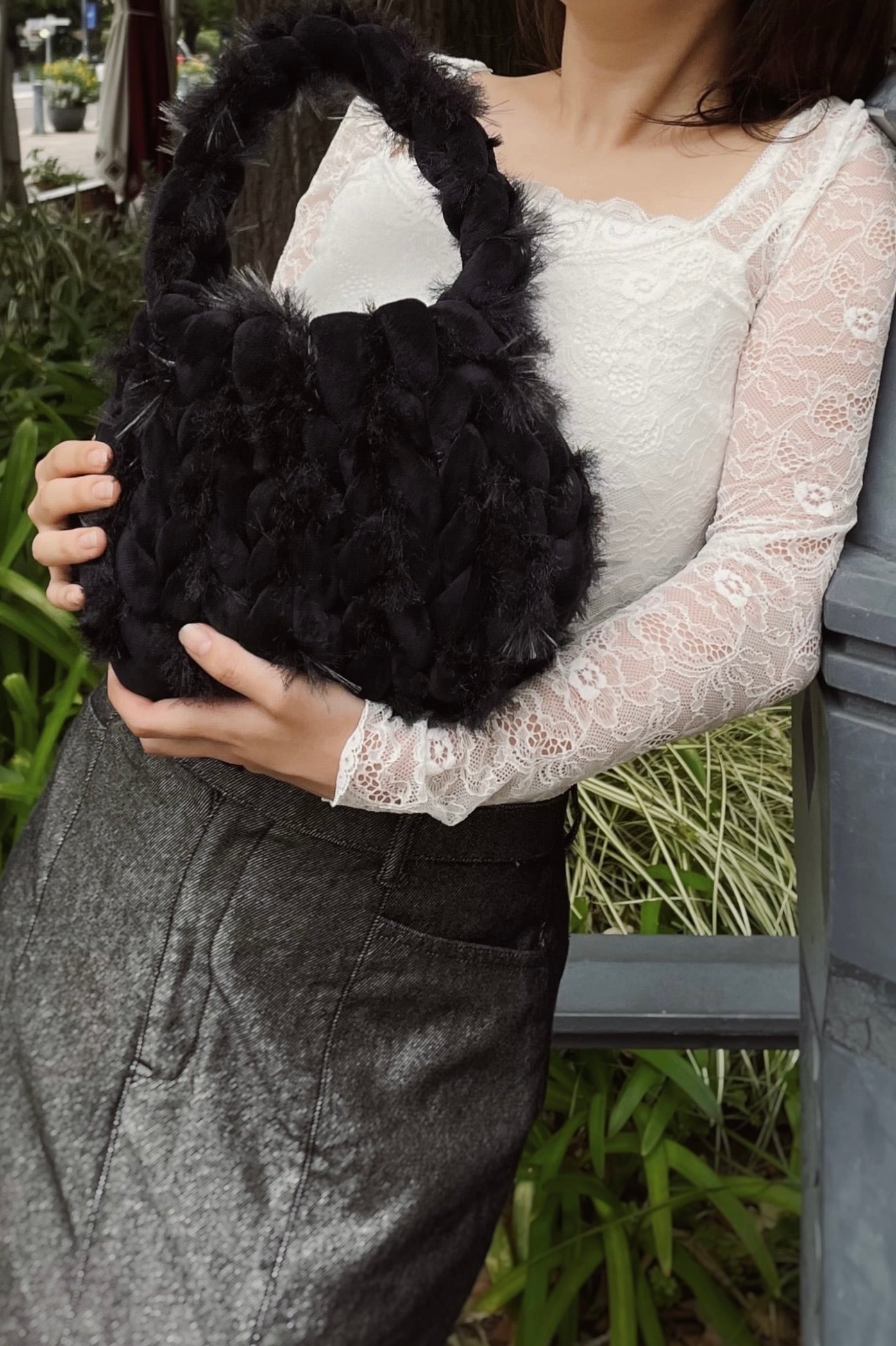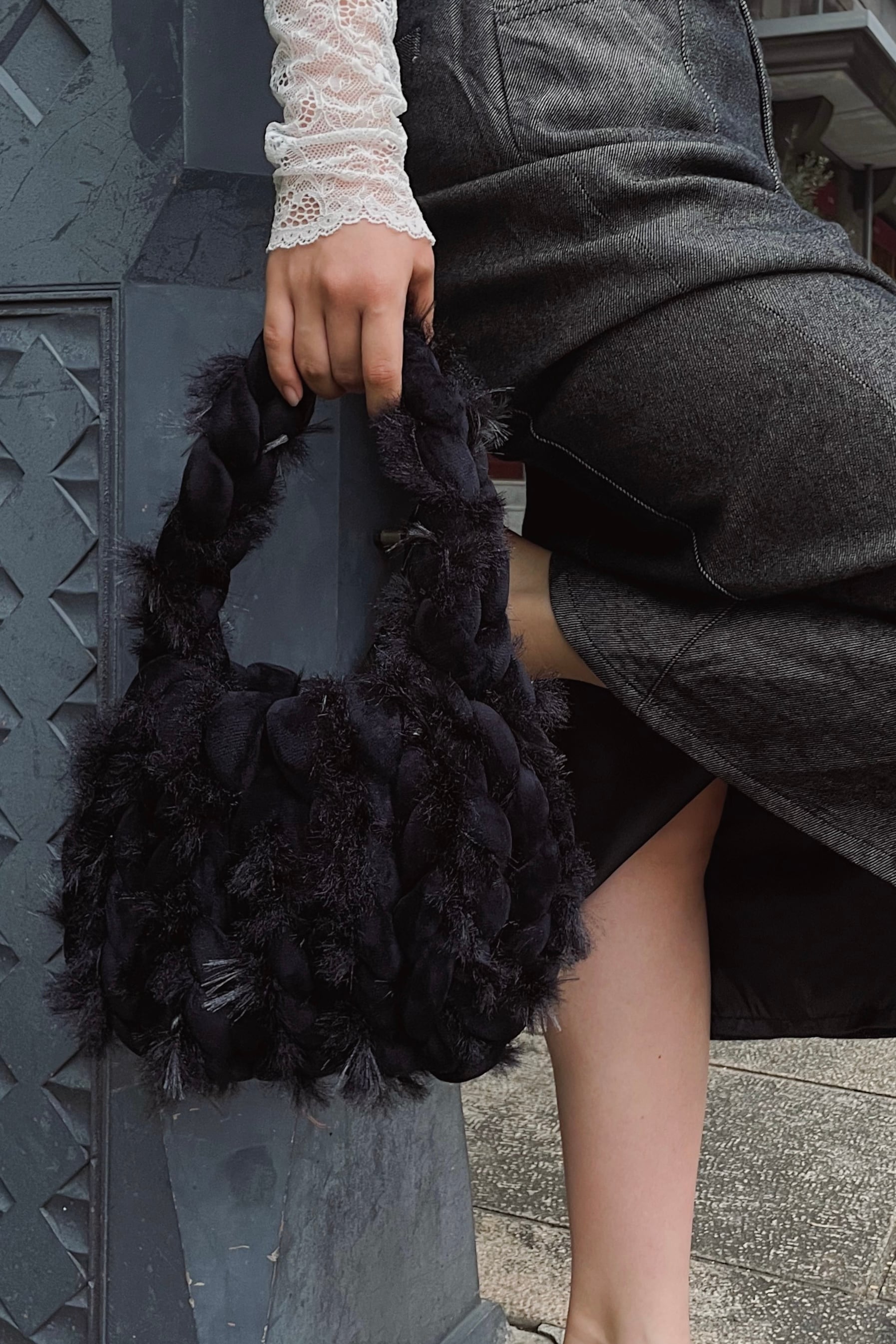 ベロアのなめらかな手触りとレーヨン混の毛糸の光沢感が、ブラックの中に軽やかな輝きを与え、奥行きのある独特の質感を演出。毛糸にはブラックにグレーが織り交ぜられており陰影が生まれることで、より立体的な印象に。ツンとした質感ながらも柔らかさを兼ね備えた独特な手触りが特徴です。