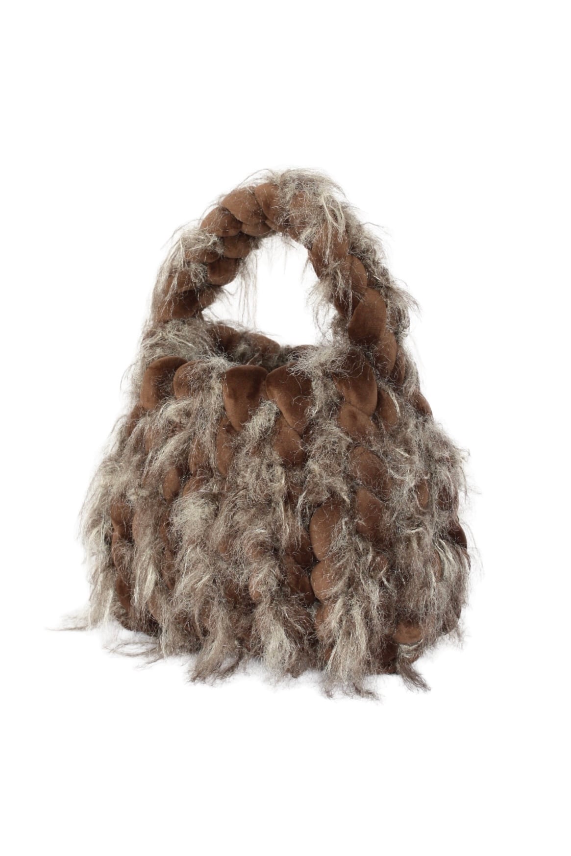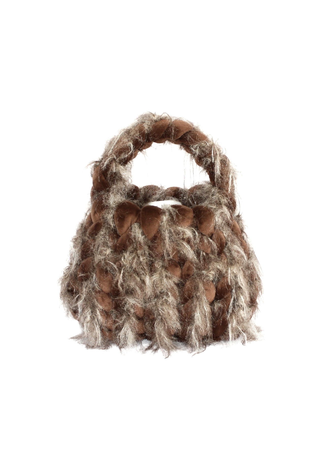 重厚感のあるダークブラウンを基調にしたバッグは、日本製のファーヤーンとベロアのチャンキーニットで仕上げられています。レーヨン混の毛糸を使用しているため、手に触れた瞬間に感じる、滑らかさと温かみが魅力です。
